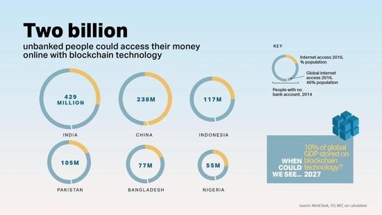 20亿成年人没有银行账户,因为他们没有银行可用,他们要么在文化上受到排斥(尤其是女性),要么收入太低。如果没有融资渠道,人们就会依赖现金,无法有效地储蓄或投资,而且会陷入债务负担中。区块链技术支持者认为,解决这个问题的办法是完全忘记银行。