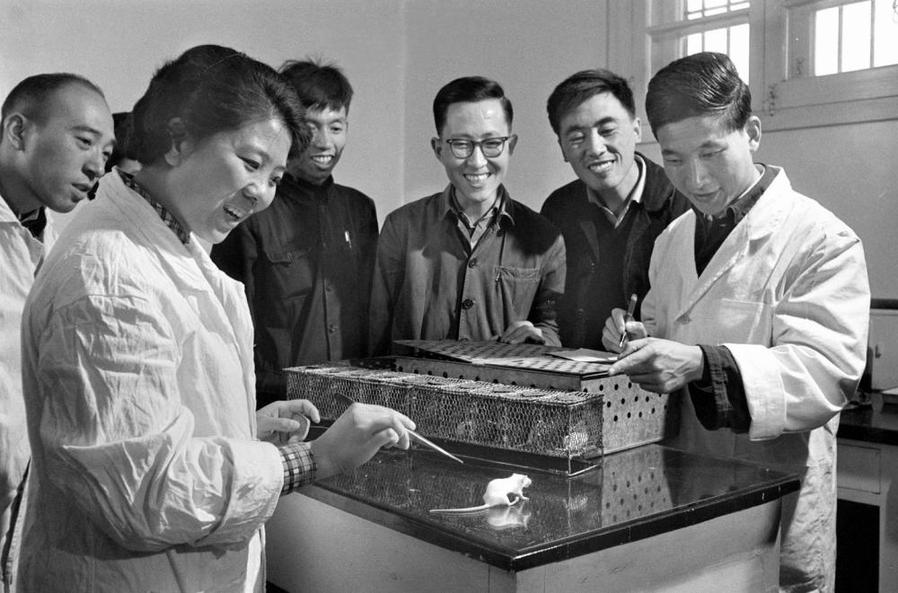 1965年9月17日,中国首次人工合成了结晶牛胰岛素。图中科学工作者正在将人工合成的产物注入小白鼠体内,测验它的生物活力。新华社资料照片