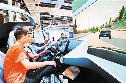 在2021世界人工智能大会展览区,参观者体验一款智能座舱的仿真自动驾驶功能。 新华社记者 方 喆摄
